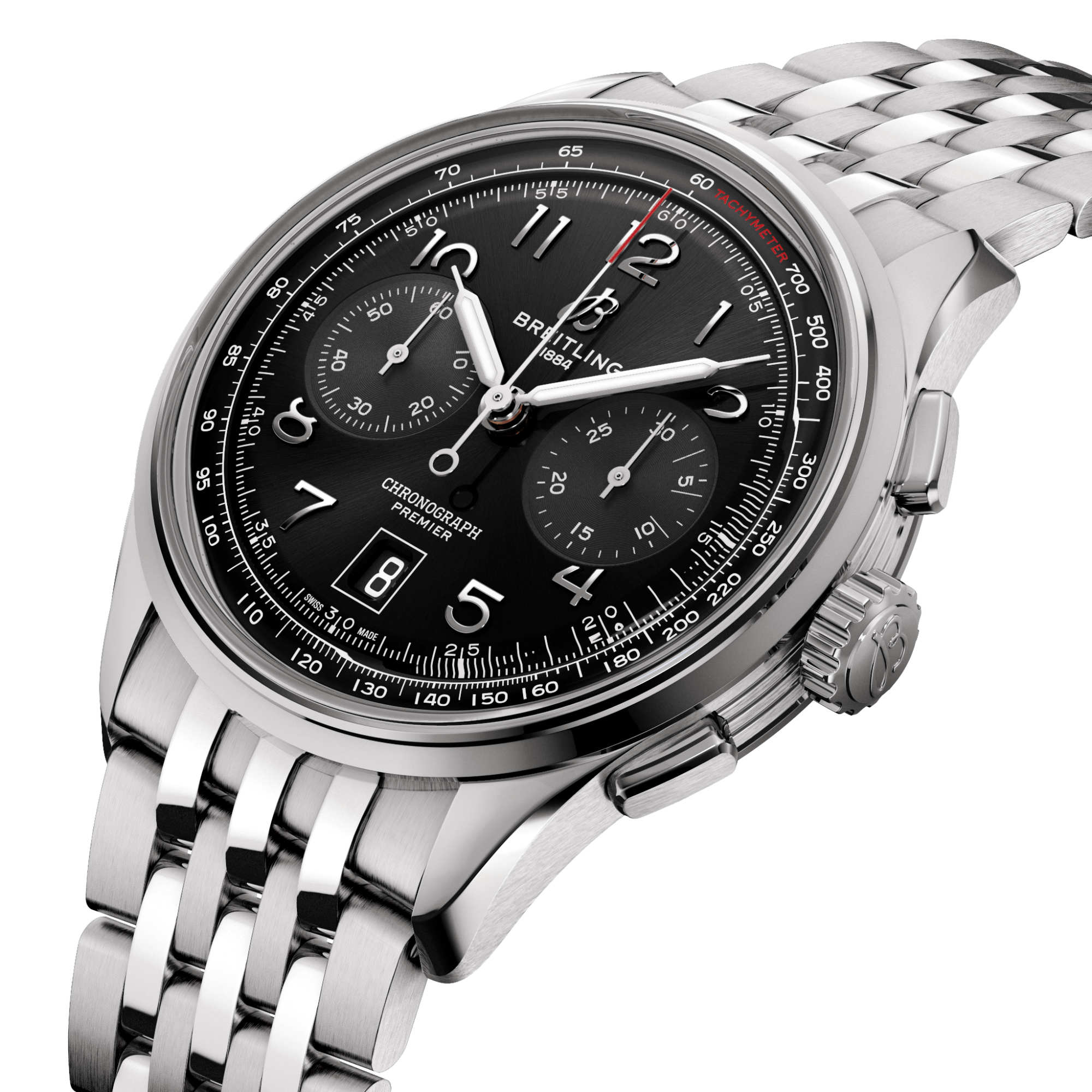 Der Premier B01 Chronograph 42 ist in verschiedenen Zifferblattfarben und Gehäusematerialien erhältlich. Sie ist wahlweise mit einem klassischen Alligatorlederarmband oder einem eleganten siebenreihigen Metallarmband erhältlich. Auch die heutige Premier entspricht den kompromisslosen technischen Standards von Willy Breitling mit ihrem aussergewöhnlichen Uhrwerk mit Selbstaufzug—dem COSC-zertifizierten Breitling-Manufakturkaliber 01—, welches auf höchste Präzision, Zuverlässigkeit und Funktionalität ausgelegt ist.