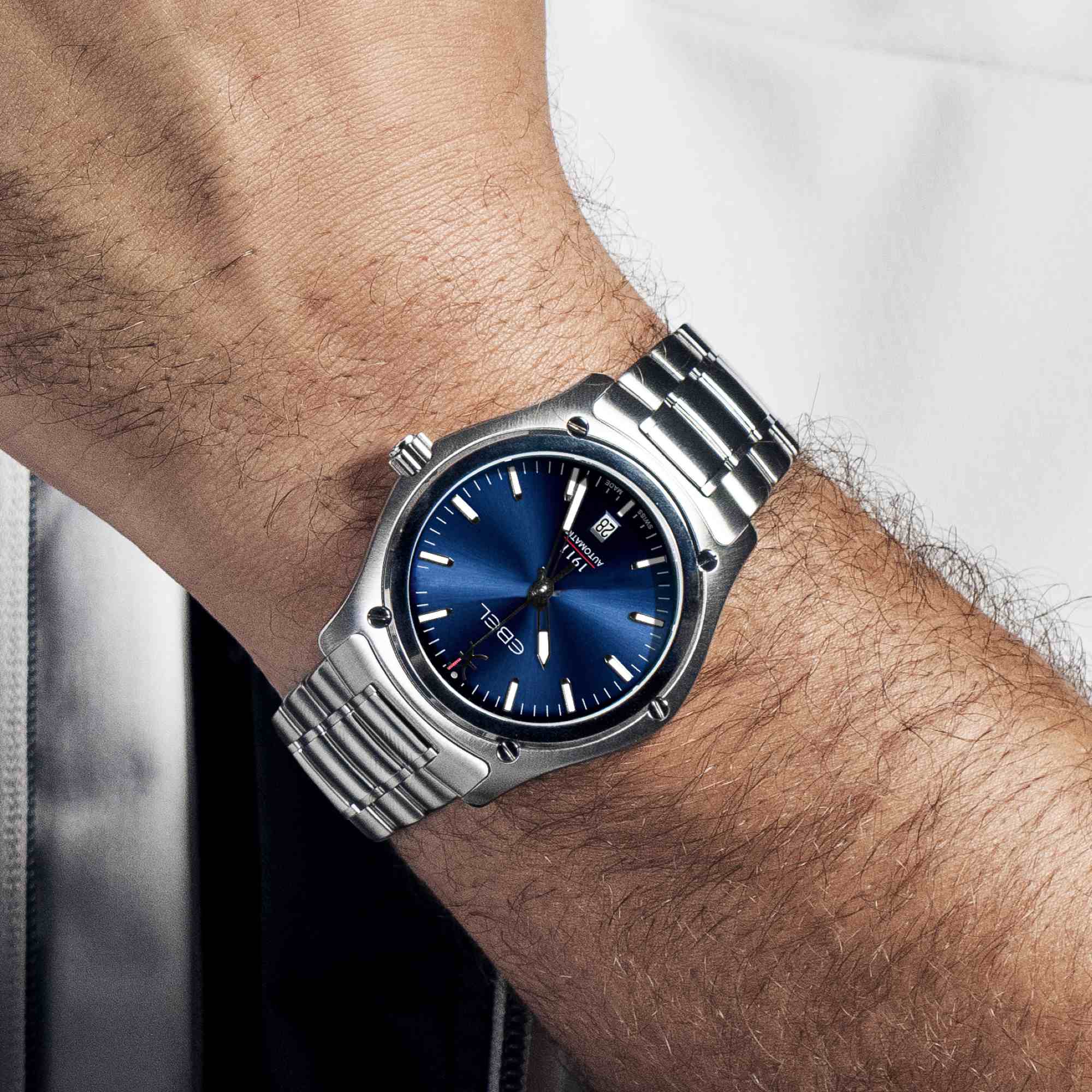 Ref. 1216615 - EBEL 1911 Herrenuhr, Gehäuse aus Edelstahl, Ø 42 mm, blau galvanisiertes Zifferblatt mit applizierten Super-LumiNova® Indizes, Datumsfenster auf 6:00 Uhr, innenseitig entspiegeltes Saphirglas, Armband aus Edelstahl, Faltschließe, zusätzliches Gewebeband (hergestellt aus recyceltem Kunststoff aus dem Meer) mit Kork-Innenseite, Schweizer Automatikwerk, wasserdicht bis 10 bar.