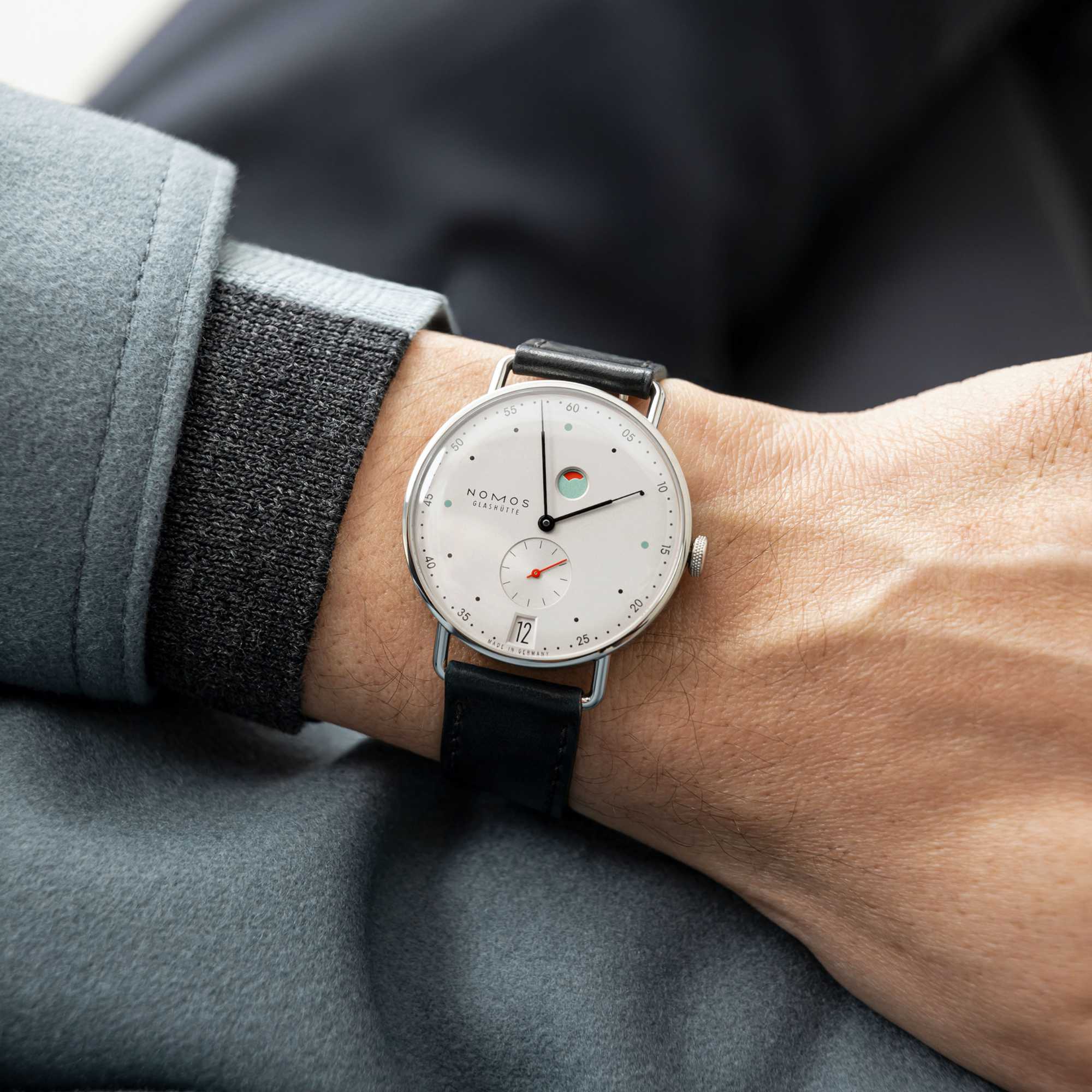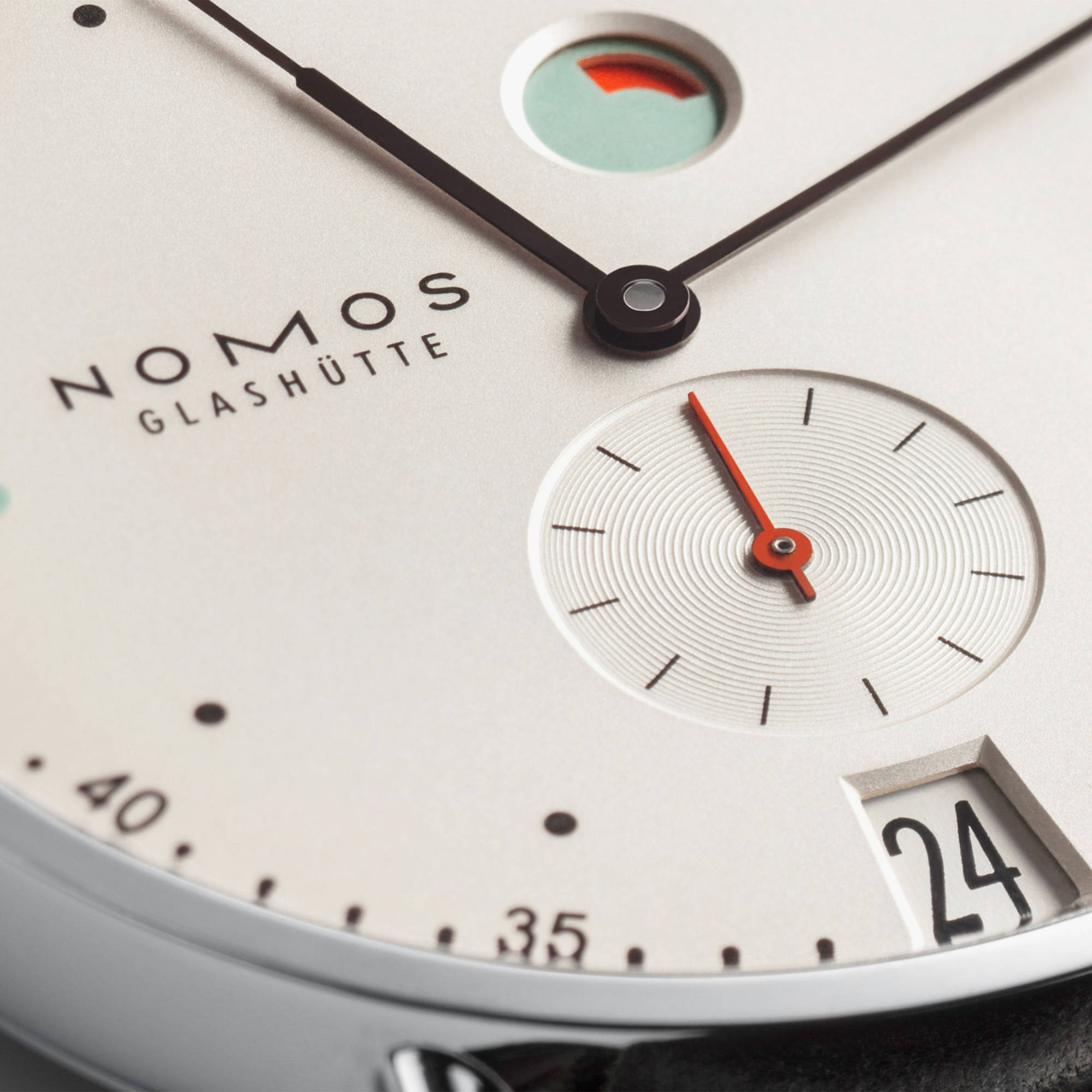 Zeiger: Stahl, schwarz oxiidert, Sekundenzeiger rot