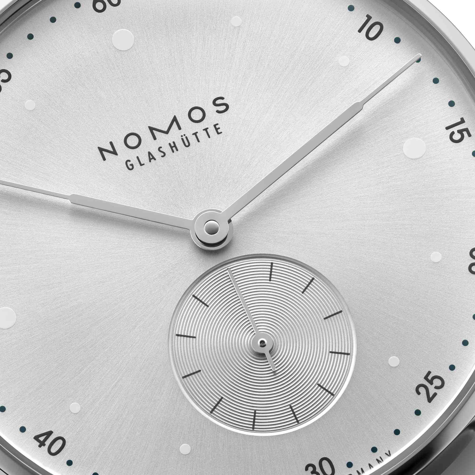 Galvanisiert, versilbert, mit Strahlenschliff, arabisch, Stundenindizes bei drei, neun und zwölf Uhr hellgrau, Minuterie grau