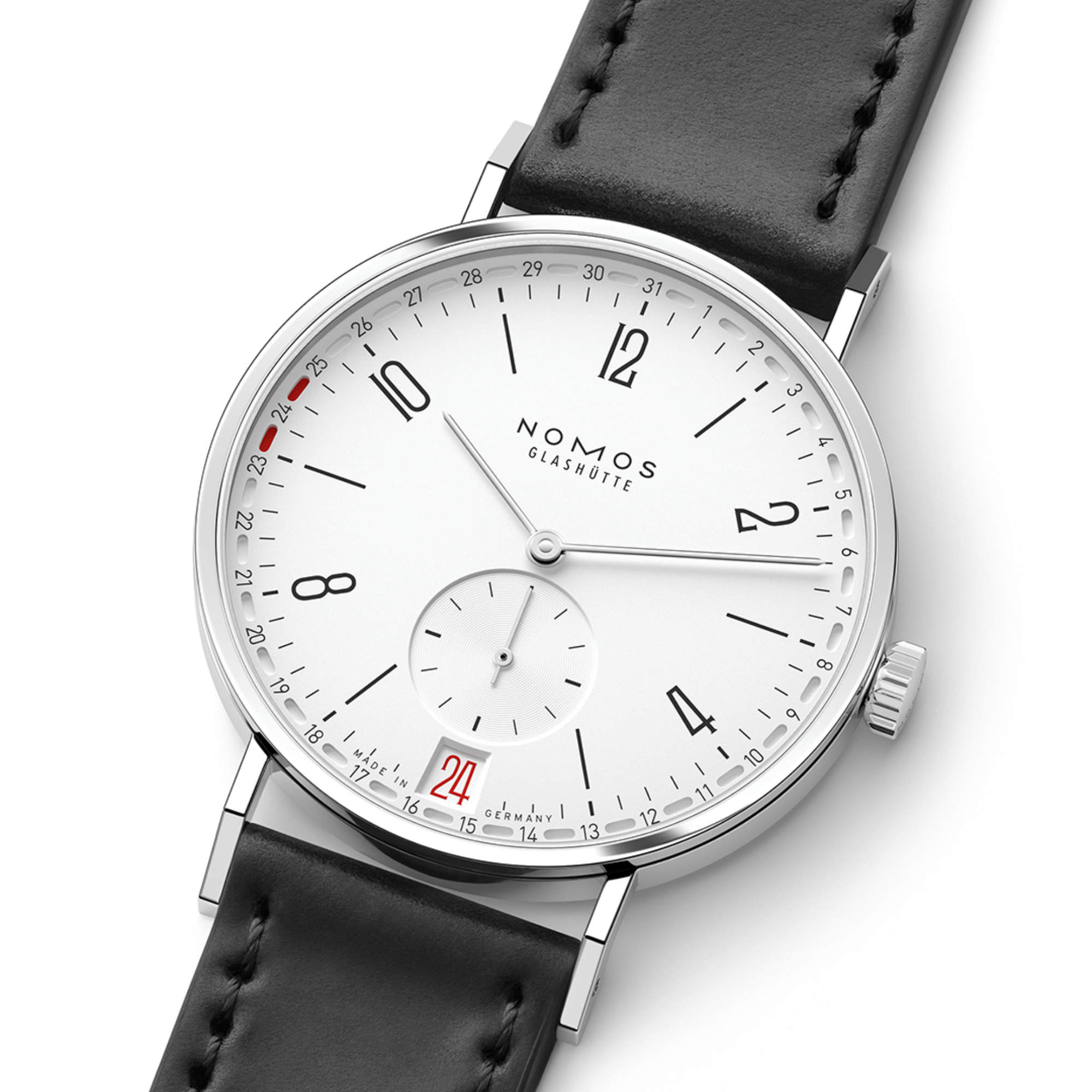 Ref. 135 - Liebe auch beim zweiten Blick: Diese Tangente mit einem Durchmesser von 37,5 Millimetern verfügt über zwei Datumsanzeigen in Rot, die sich harmonisch ergänzen. Das exklusive NOMOS-Ringdatum – hier erstmals in einer Handaufzugsuhr – führt den Monatslauf vor Augen; das große Datumsfenster auf 6 Uhr fokussiert derweil auf den Tag. Um Mitternacht oder bei Betätigung der Schnellverstellung bringen die beiden Anzeigen das weiß versilberte Zifferblatt mit rhodinierten Zeigern auf doppelt schöne Weise in Bewegung.