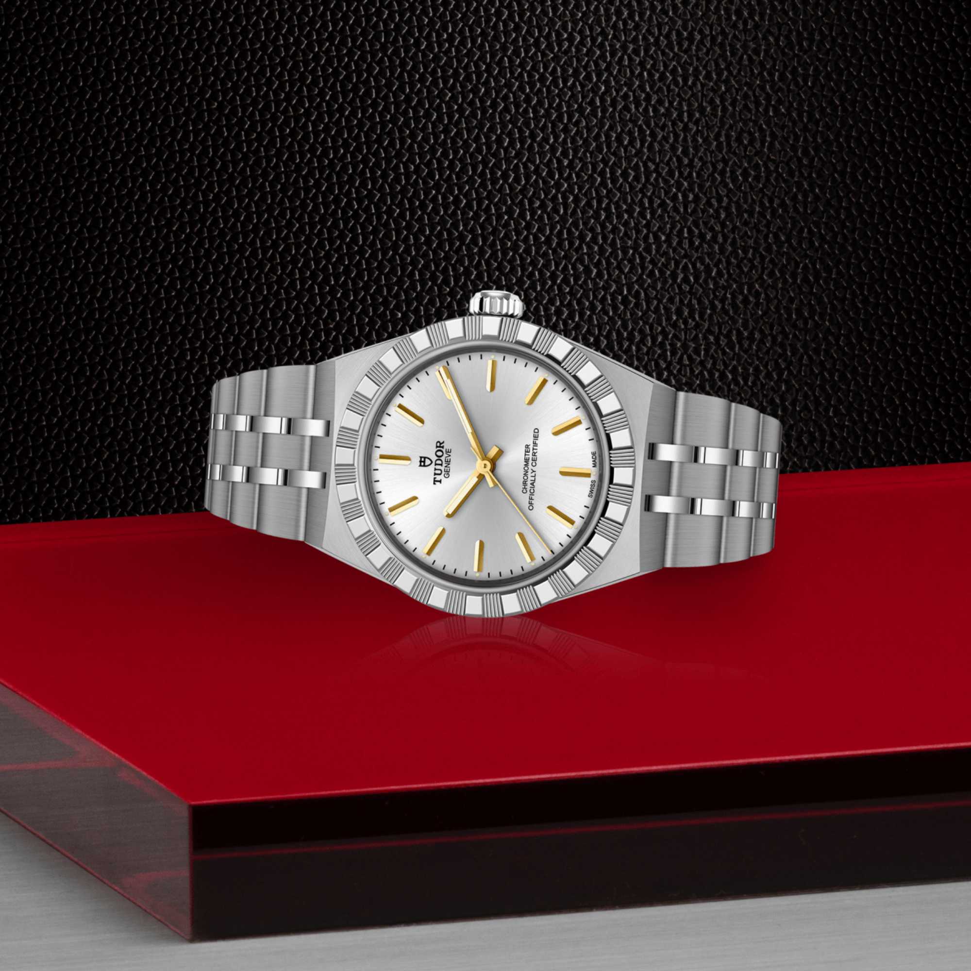 Ref. M2830A1A0-0002 - Mit ihrem integrierten Metallarmband, das nahtlos in das Gehäuse übergeht, zeichnet sich die TUDOR Royal durch ein fließendes und stilsicheres Design aus. Charakterisiert durch ihre drei breiten satinierten Bandelemente, zwischen denen zwei schmalere polierte Elemente positioniert sind, und ihre „T-fit“-Schließe, betont die glatte Beschaffenheit ihrer Oberflächen die große Aufmerksamkeit, die TUDOR dem Tragekomfort schenkt. Erhältlich in Edelstahl oder mit abwechselnden Elementen in Edelstahl und Gelbgold, sprechen die Modelle dieser Linie mit ihrer fein bearbeiteten Oberfläche jeden Geschmack an.