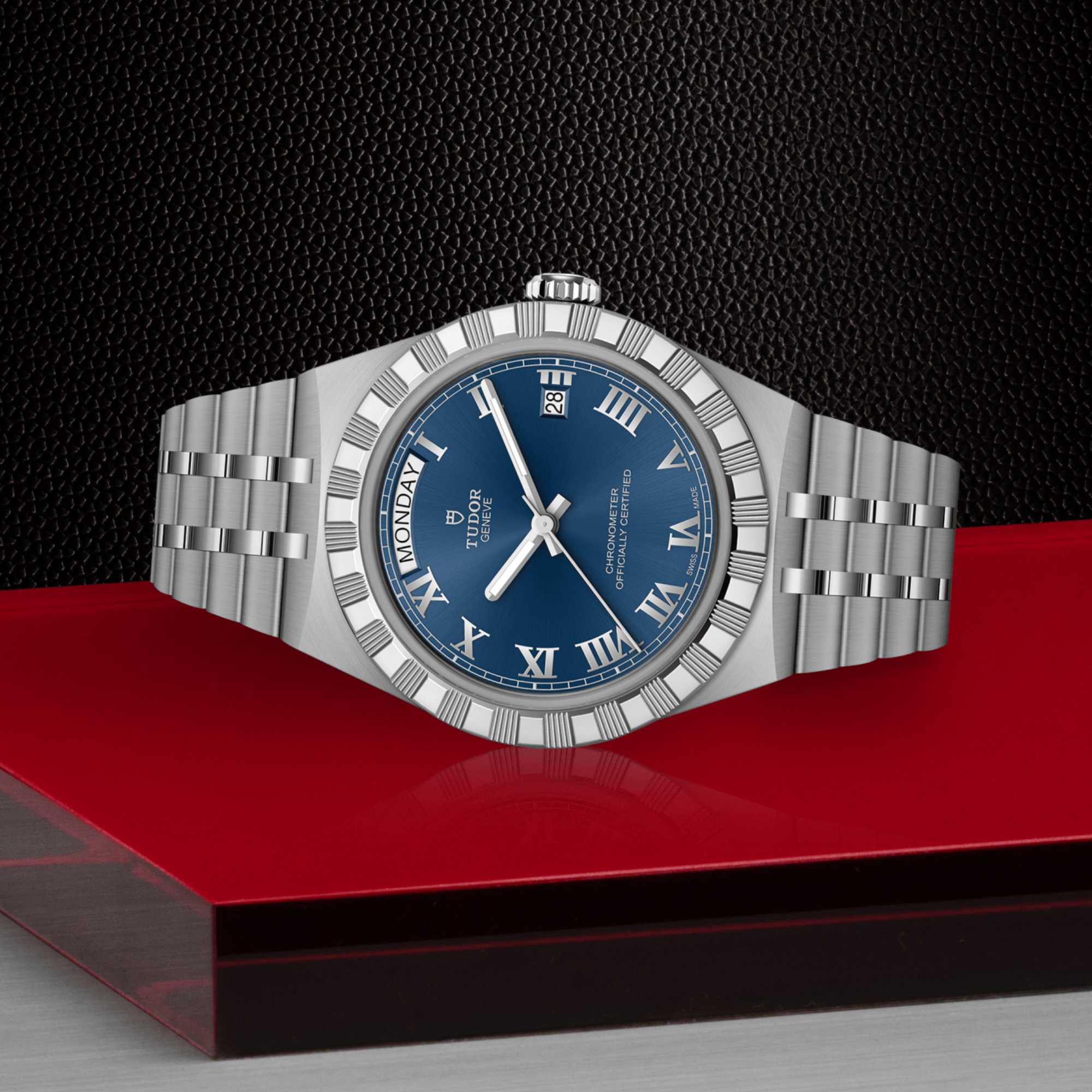 Ref. M2840D1A0-0002 - Mit ihrem integrierten Metallarmband, das nahtlos in das Gehäuse übergeht, zeichnet sich die TUDOR Royal durch ein fließendes und stilsicheres Design aus. Charakterisiert durch ihre drei breiten satinierten Bandelemente, zwischen denen zwei schmalere polierte Elemente positioniert sind, und ihre „T-fit“-Schließe, betont die glatte Beschaffenheit ihrer Oberflächen die große Aufmerksamkeit, die TUDOR dem Tragekomfort schenkt. Erhältlich in Edelstahl oder mit abwechselnden Elementen in Edelstahl und Gelbgold, sprechen die Modelle dieser Linie mit ihrer fein bearbeiteten Oberfläche jeden Geschmack an.
