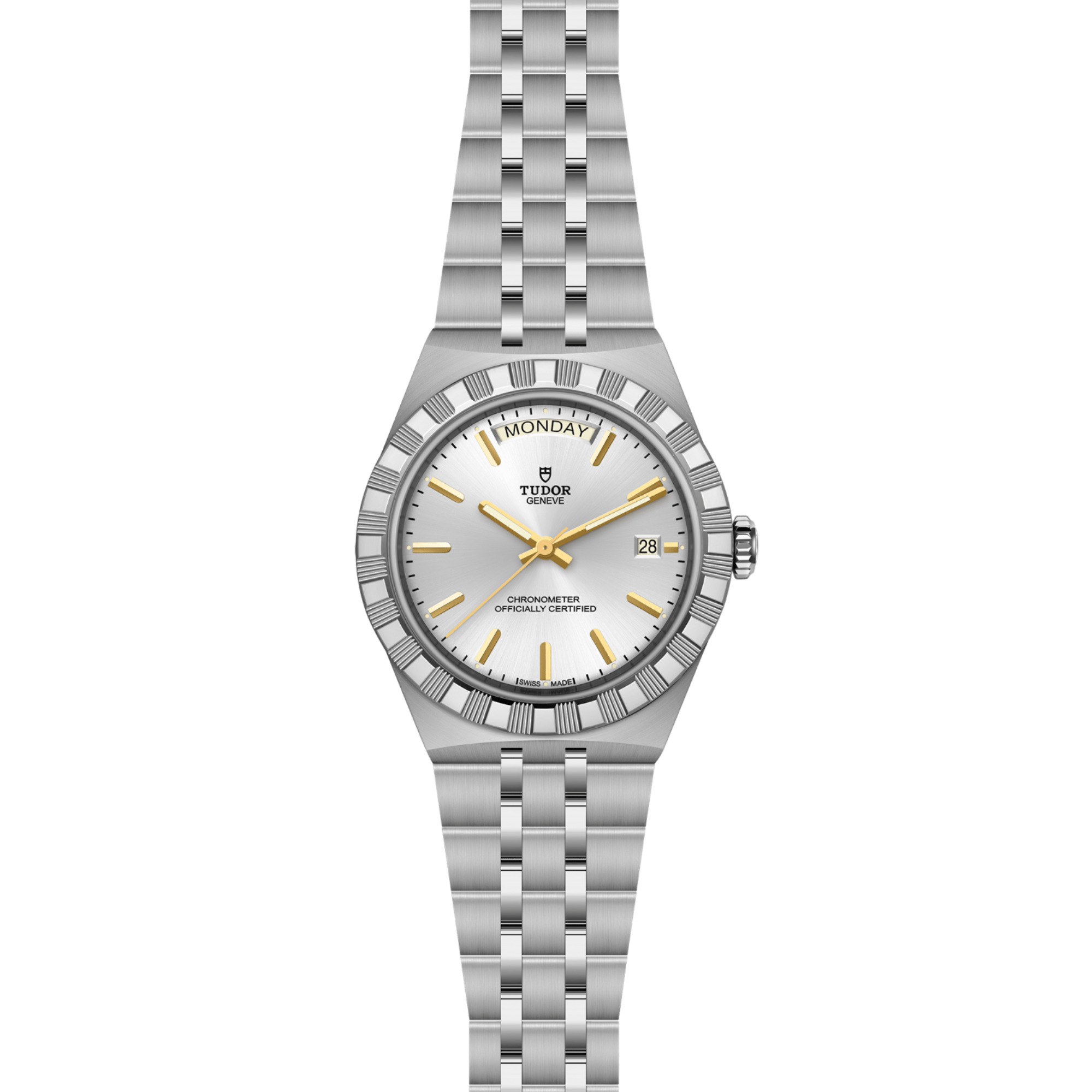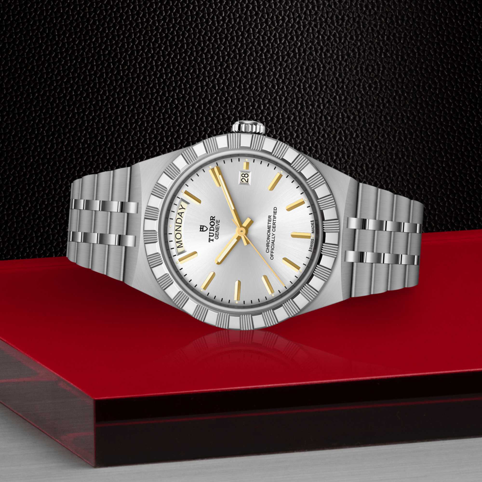 Ref. M2840D1A0-0004 - Mit ihrem integrierten Metallarmband, das nahtlos in das Gehäuse übergeht, zeichnet sich die TUDOR Royal durch ein fließendes und stilsicheres Design aus. Charakterisiert durch ihre drei breiten satinierten Bandelemente, zwischen denen zwei schmalere polierte Elemente positioniert sind, und ihre „T-fit“-Schließe, betont die glatte Beschaffenheit ihrer Oberflächen die große Aufmerksamkeit, die TUDOR dem Tragekomfort schenkt. Erhältlich in Edelstahl oder mit abwechselnden Elementen in Edelstahl und Gelbgold, sprechen die Modelle dieser Linie mit ihrer fein bearbeiteten Oberfläche jeden Geschmack an.