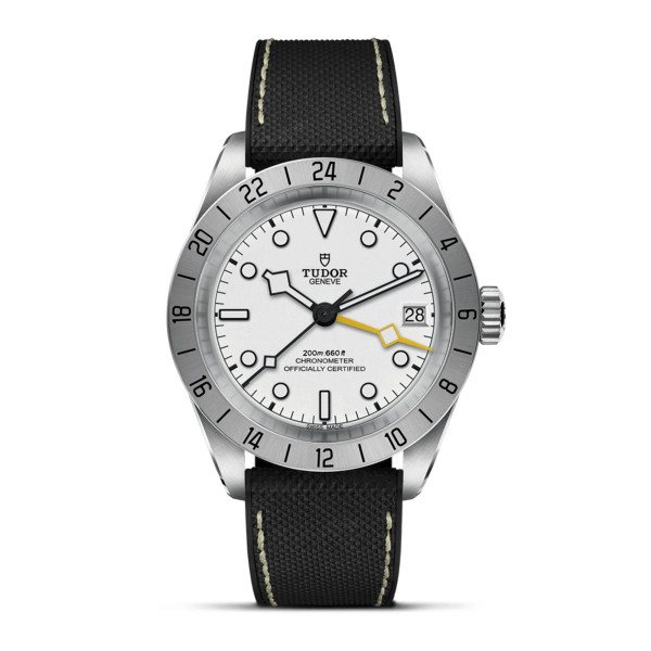 Ref. M79470-0006 - Die Black Bay Pro ist eine robuste Armbanduhr mit einer satinierten feststehenden Lünette mit 24‑Stunden-Graduierung und einem gelben 24‑Stunden-„Snowflake“-Zeiger sowie dem TUDOR Manufakturwerk Kaliber MT5652 mit eingebauter GMT-Funktion. Nun geht TUDOR beim Design noch einen Schritt weiter – mit einem besser ablesbaren opalfarbenen Zifferblatt. Zudem sind die Stundenindizes aus Keramik und die Zeiger schwarz umrandet, was einen starken Kontrast erzeugt. Dank ihrer optimalen Ablesbarkeit ist diese Uhr für jede Art von Forschung geeignet – sei es im Polareis oder in den Tiefen unterirdischer Höhlen.